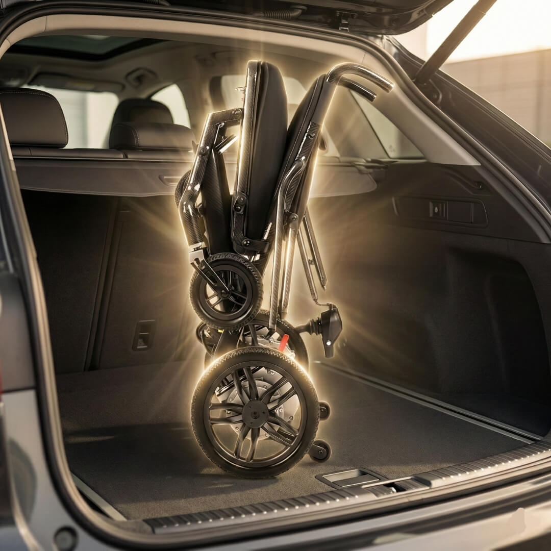 A quick fold transforms it into a compact, travel-ready wheelchair.